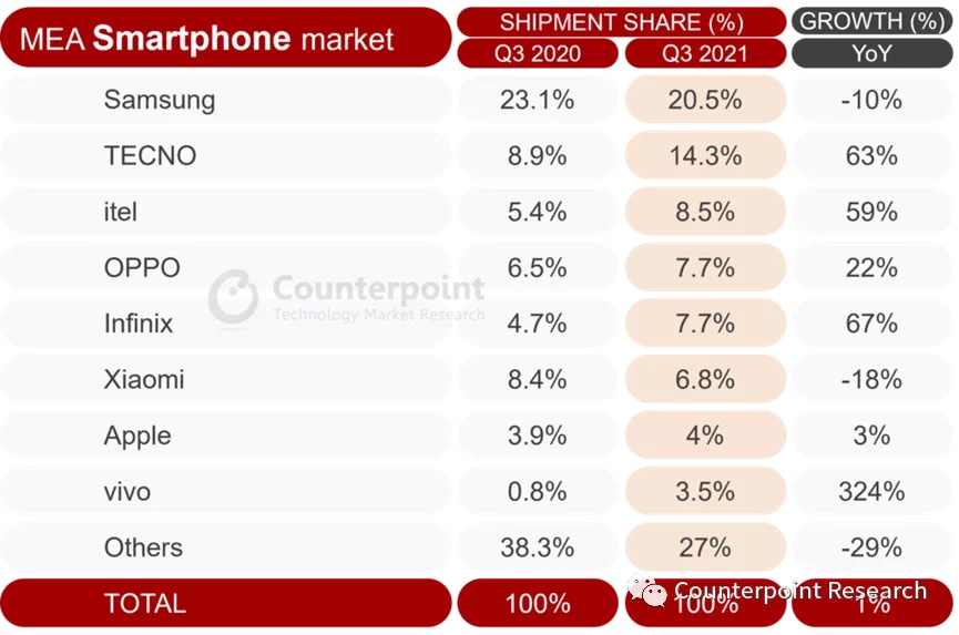 依据Counterpoint Market Monitor(商场监测服务)发布的最新研讨,中东非区域的智能手机出货量在2021 年第三季度同比增加 1%,环比增加 7.5%。虽然后来者的要挟因压抑的需求而逐步衰退,且全球零部件持续缺少。但跟着数字化服务、网络连接、和移动付出变得越来越重要,智能手机商场也持续走强。